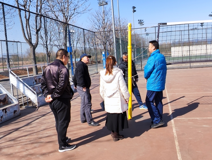 为保证本学期体育课程和群体活动的正常开展,保障全校师生运动安全,体育365官网于2022年3月2日在王欢副经理的带领下,公司公共体育教研室主任王军涛老师、李强老师,场地管理办公室郭佳佳老师、杨青老师和场地工作人员对公司两校区的体育场地进行了安全大检查。在检查过程中,各位老师着重对课程所需体育器材的种类和数量、场地上体育器械的安全性进行了仔细的检查。