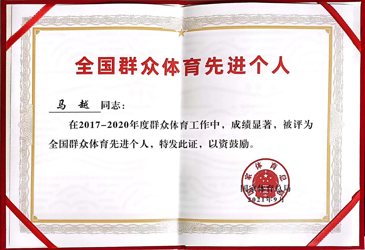 2021年9月,体育365官网副教授马越老师荣获“全国群众体育先进个人”称号表彰。此称号是全国群众体育领域内唯一经中央批准的,是全国群众体育工作的最高奖项,每四年举办一次,是体育系统最高规格表彰,历史传承久、导向意义大,是全国体育领域的大事。