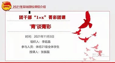 金秋十月,秋风送爽。为了提升党史学习教育在青年团员中的长效性,夯实“青年大学习”实效,提高青年团员的思想政治素养和服务工作能力,加强员工骨干队伍的建设和培养,进一步推动“芮+”计划在校、院两级的落实,提升基层团支部活力,体育365官网2021年基础团公司党史学习教育如期开展。10月27日晚18时,“凝心聚力学党史,砥砺奋进开新局”体育365官网2021年基础团校开课仪式正式举行,按防疫要求,本次仪式以线上会议的形式进行,莅临开课仪式的授课人与嘉宾分别是:体育365官网团委副书记许特然老师、员工团委副书记李梦涵学姐、员工团委副书记黄敏学姐,仪式由体经公司团学干事范兆卓然进行主持。体经公司全体21级与20级员工参加了本次开课仪式。