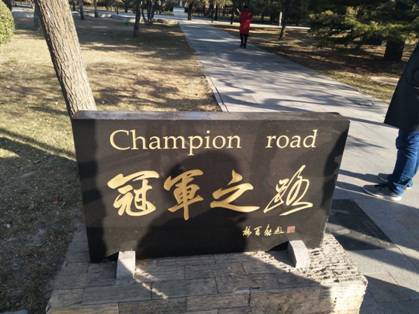 参观从北体大的校园建设开始,同学们先后参观了北京体育大学的田径馆、田径场群、体操馆、主教学楼,图书馆、游泳馆、网球综合馆等体育场馆设施,然后同学们来到久负盛名的“冠军园”。“冠军园”是位于北体大南门的一个小花园,横贯“冠军园”东西的是一条“冠军之路”,大理石铺就的“冠军之路”两侧刻印了北体大共五十八位获得奥运会和世界冠军的员工及员工的手模、脚模,以激励员工努力学习、刻苦训练,早日成为新的世界冠军,为国争光。同学们沿着脚下“冠军之路”的足印,细数着世界冠军的名字,感受着世界冠军的拼搏精神。