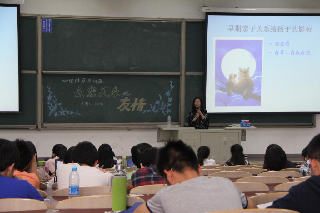 讲座伊始张老师先从社会关系与人生成功、幸福感的关系入手,以自己为例展示了自己的人际圈,她在ppt上晒出了自己与家人、朋友、老师的合照,引出了一个人应该有的人际“披萨饼”以及人际交往“面包圈”,并多次分享自身经历来讲述这些人际圈对自己的影响。张老师开始从父母对孩子儿时的影响分析孩子之后的成长之中的依恋类型以及这种影响对孩子的社交表现的影响,总结早期良好的亲子关系会给孩子带来安全感和自尊感的结论,同学们都听得津津有味。