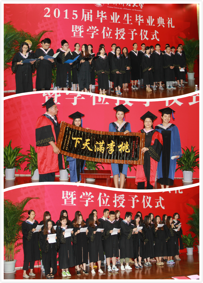 典礼正式开始之前,在场的所有师生及亲友欣赏了由2015届毕业班员工制作的毕业视频,在视频中,2015届毕业生纷纷抒发了自己对于毕业的感怀、对母校的留恋不舍、对未来的憧憬等情感,结尾的张张合影浓缩了大学四年的点点滴滴,在浓厚的毕业氛围中,毕业典礼暨学位授予仪式正式拉开序幕。首先,副经理张自如副教授宣读了《体育365官网2015届毕业生授予学位的决定》。随后,党总支书记林琼教授宣读了《体育365官网2015届优秀毕业生名单》,经理高涵教授为2名市级优秀毕业生颁发了获奖证书和礼品,三位副经理张自如副教授、姜春华副教授、张本家副教授为8名校级优秀毕业生颁发了获奖证书和礼品,院领导分别和优秀毕业生们合影留念。