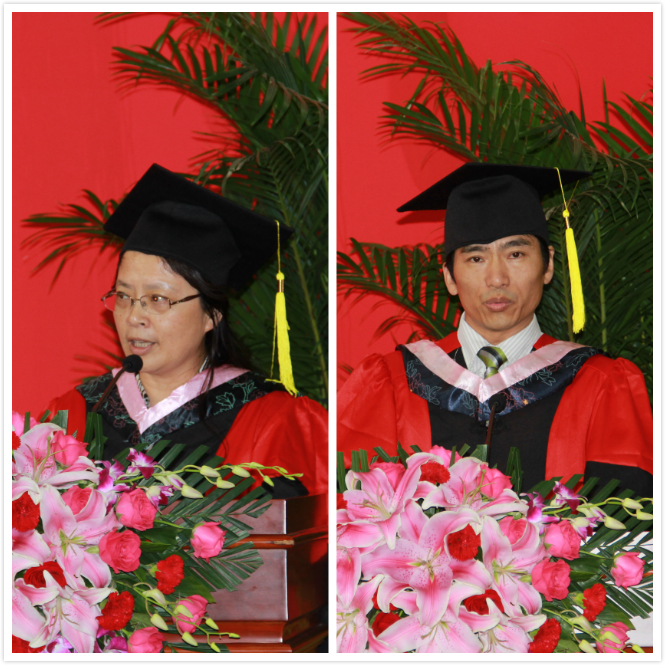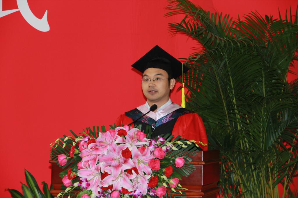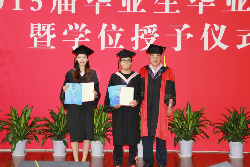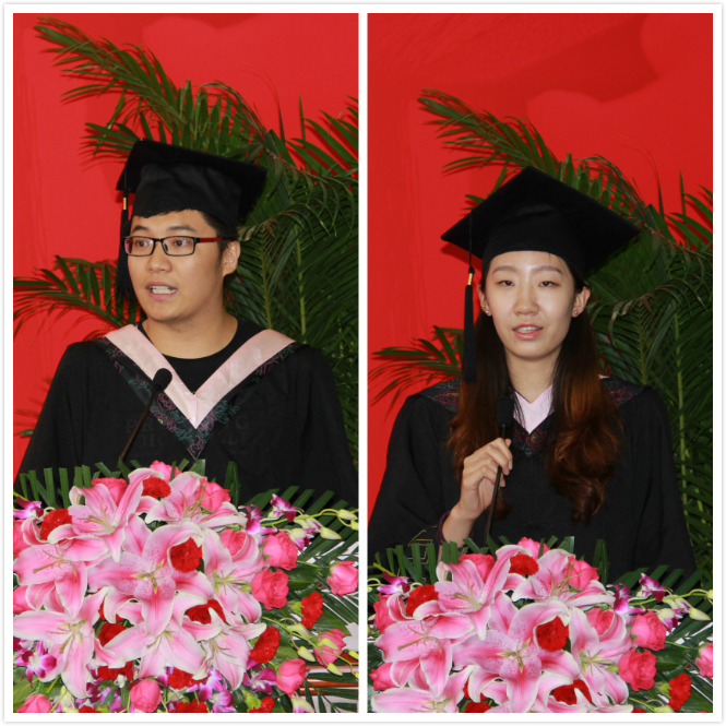 优秀毕业员工代表田栋、胡娅囡代表2015届毕业生上台发言。在田栋的发言中,他追忆了自己大学中最普通的每一天,感念了师恩、友情,浓浓的离别不舍之情溢于言表,台上台下的师生几度哽咽。胡娅囡在自己的发言中感谢母校,感念师恩,表达了对未来梦想追求的坚定信念以及对毕业生们美好的祝福。