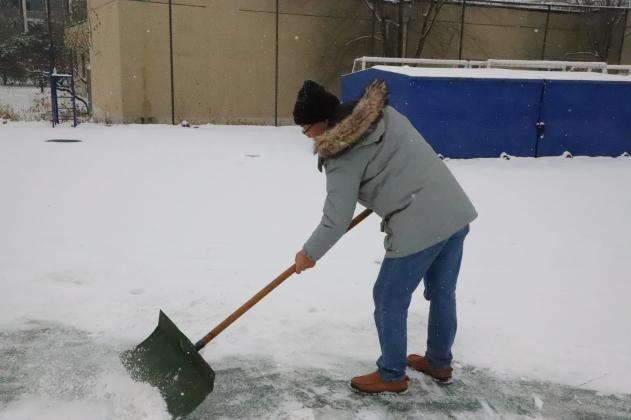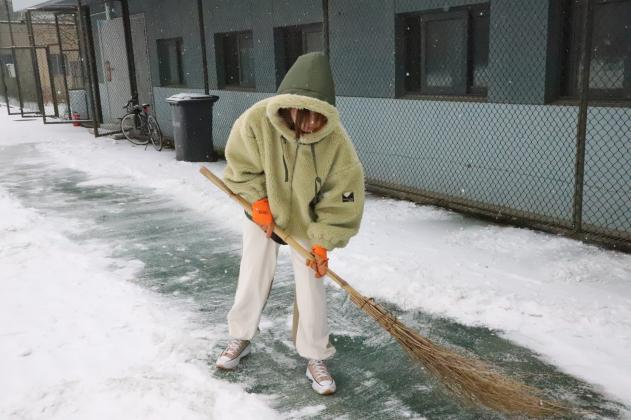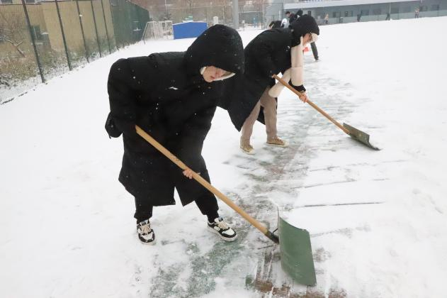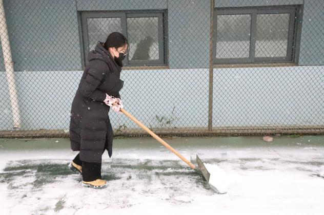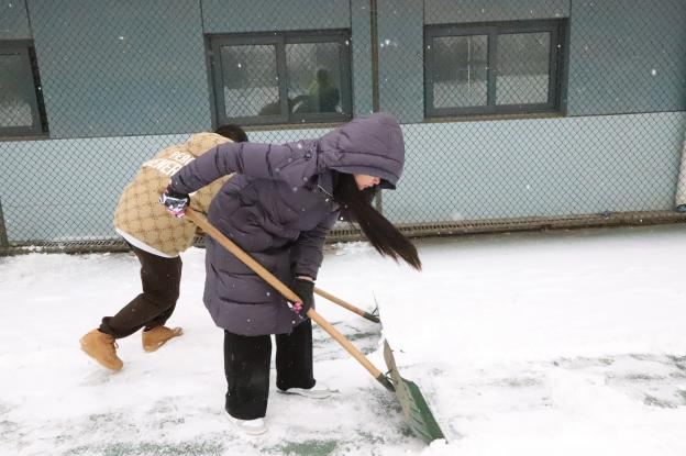 早晨9点,随着第一缕阳光洒在雪白的校园,师生党员们齐聚体育馆,手持扫雪工具,满怀热情地投入到了这次劳动之中。面对铺天盖地的雪景,大家分工明确,有的负责清扫人行道,有的负责清理运动场地,还有的负责田径场入口区域。在寒风中,大家的动作迅速而有序,每一次铲雪、每一次扫除都充满了节奏和力量。