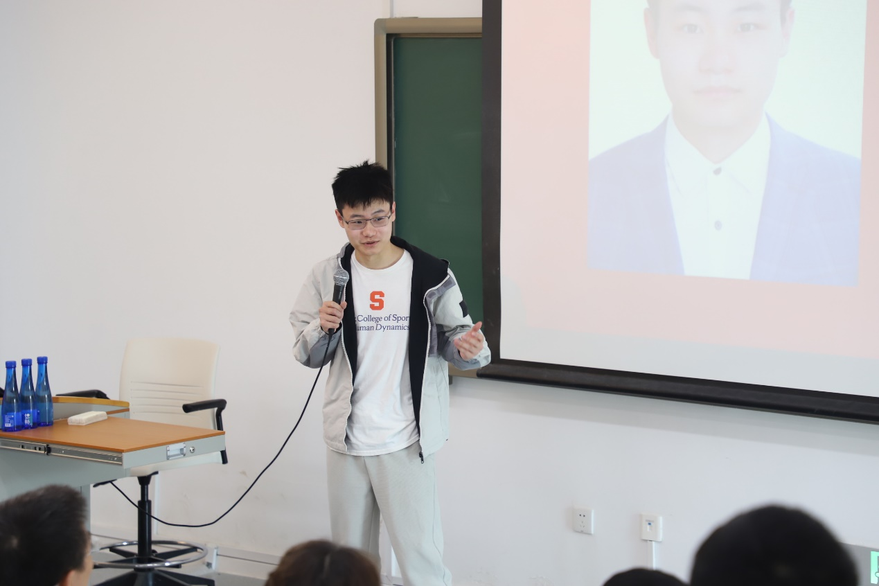 郭恺阳同学是雪城大学在读三年级员工,他向同学们分享了在雪城大学大卫·福尔克体育公司的求员工活和见闻,并就提问向同学们介绍了雪城大学体育管理专业的课程设置、国外体育管理的发展方向、国内外体育产业管理的不同等问题。