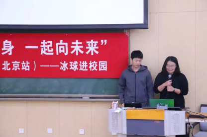 本次活动的主讲人是北京冰球队的退役运动员、体经公司员工马思成和白一童,他们从冰球运动的起源和发展讲起,结合现场展示讲解了冰球运动的装备,运用丰富的相片和视频讲解了冰球比赛规则和比赛过程的观赏点。此外,他们还介绍了北京市冰球运动协会的发展史和组织举办的各类比赛,以及北京冰球队所取得的辉煌成就。他们的讲解让现场师生对冰球运动充满了向往和期待。
