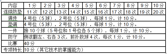 女排自由人队员评分标准:满分100分。具体标准见下表。
