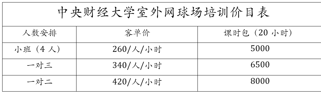 根据不同水平、不同年龄将学员分为青少年0级、青少年1.0级、青少年2.0级、青少年2.0级以上、成人班,针对不同年龄不同水平学员制定针对性培训计划。包括技术动作指导、技术练习、体能训练、战术思维培养、模拟对练、网球比赛、牵引拉伸等,结课后颁发官方认证的培训证书。