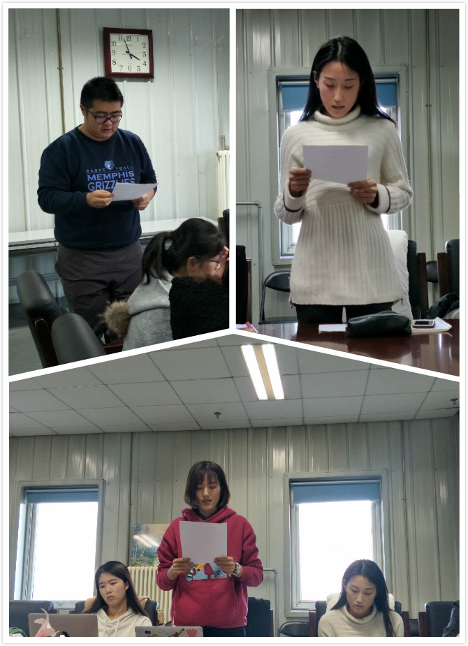 党支部书记胡庆老师从“一二·九”抗日救亡运动爆发的背景说起,强调了在国家危难,民族危亡时刻,是青年员工热血地呼喊唤醒了中华民族的斗志,“一二·九”运动彰显出青年员工勇于担当的精神品质。以历史做引领,结合党的十九大有关精神和习近平总书记系列重要讲话精神,胡老师呼吁党支部成员要坚定信仰,牢记党的嘱托和号召,延续青年的使命与担当。“教育就是要培养中国特色社会主义事业的建设者和接班人,而不是旁观者和反对派”,胡老师引用习近平总书记今年10月30日在人民大会堂会见清华大学经济管理公司顾问委员会海外委员和中方企业家委员讲话内容,对党支部全体成员旗帜鲜明地提出要自觉增强自身政治标准和政治意识。