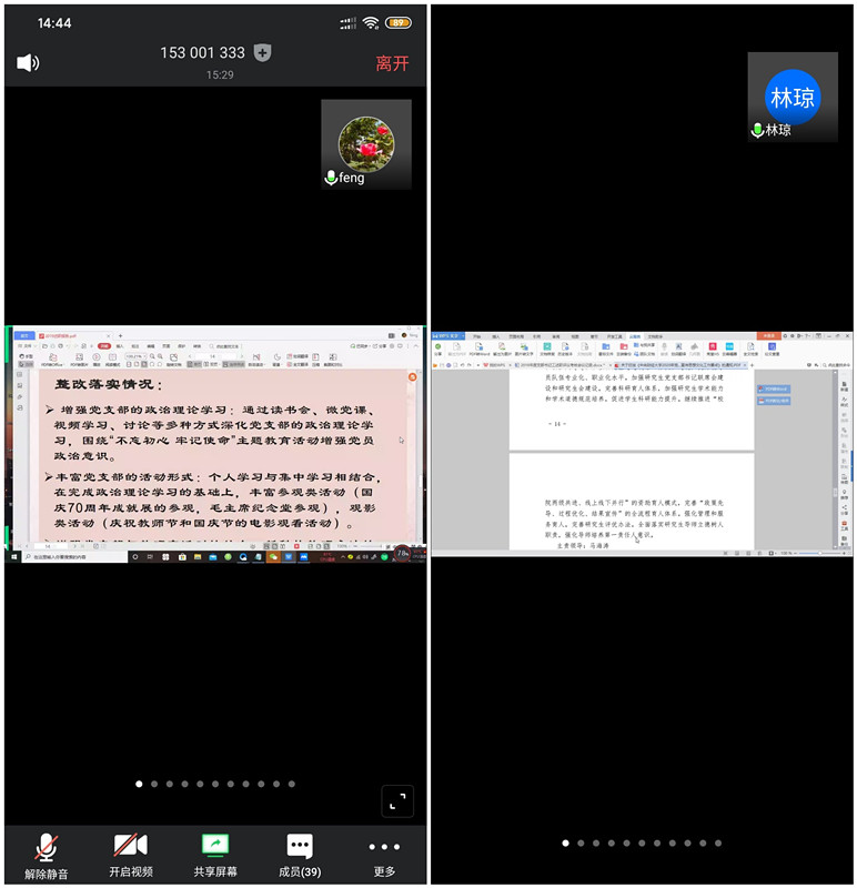 首先,林书记介绍本次考核会的召开背景,强调不同于以往的支部书记考核,本次述职考核工作和支部测评工作在线上完成,今天集中组织两个支部的教工党员共同聆听两个教工支部书记的述职,为避免出现资源不均衡造成影响直接采用语音会议形式。专业课教工党支部书记刘彩凤同志从主要工作和整改情况、存在的不足和下一步打算两个大的方面进行述职。她结合支部建设、政治理论学习、主题教育、师德师风建设、服务意识、公司其他工作和支部书记履职7个方面即讲述了2019年度主要工作情况。然后,公体课教工党支部书记杨海林同志就履职的主要情况和特点、开展工作情况、存在的主要问题和加强和改进工作思路措施四大方面总结了过去一年的工作。其中他重点介绍了开展工作情况的四个部分:落实制度加强理论学习;开展“不忘初心、牢记使命”主题教育;开展廉政教育和规章制度的学习;师德师风建设等。