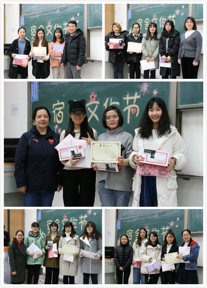 经过综合指标评选,516宿舍获得本届宿舍文化节总冠军、513宿舍为分冠军、517宿舍获得学风优秀奖、512宿舍获得风采优秀奖、515宿舍获得文化优秀奖、614宿舍获得卫生优秀奖。各个评委为获奖宿舍颁奖并合影留念。