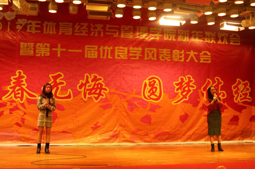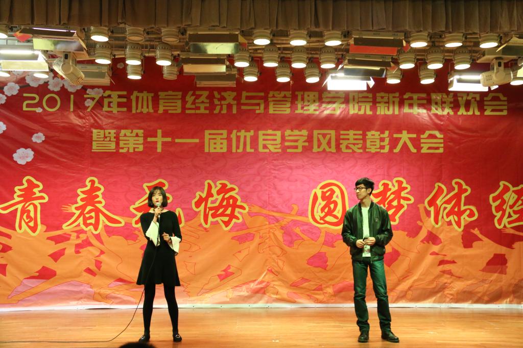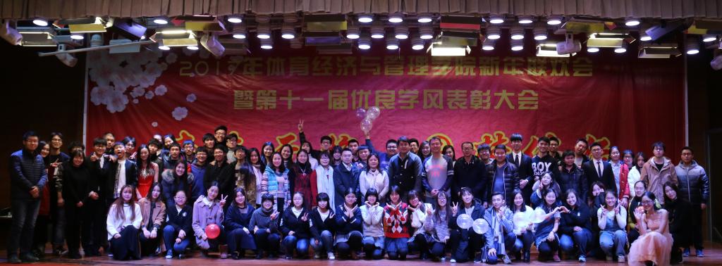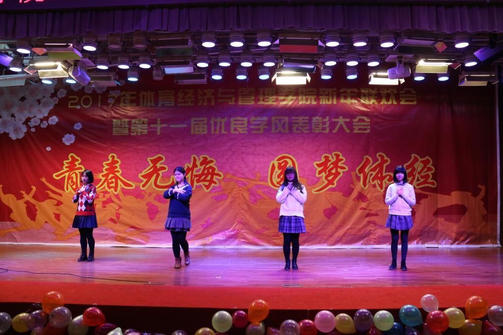 伴随着4个16级青春可爱的姑娘表演的舞蹈《新年快乐》,联欢会接近尾声“鼎故辞旧,旧雨重逢,丰年旧事娓娓道来;万象更新,新硎初试,龙马新声气势恢宏;我中央财大,如龙有灌日触天之才,吞吐大荒;我体经学子,似马有腾跃四方之志,担负乾坤”。忠诚、团结、求实、创新,这是中财大对我们的期许;笃思体行,我爱体经,体经会是一种信仰;过去的一年,我们尽善尽美,尽力做到最好;新的一年,我们当再接再厉,再创辉煌!“青春无悔、圆梦体经”体育365官网2017年新年联欢会暨第十一届优良学风表彰大会圆满结束。